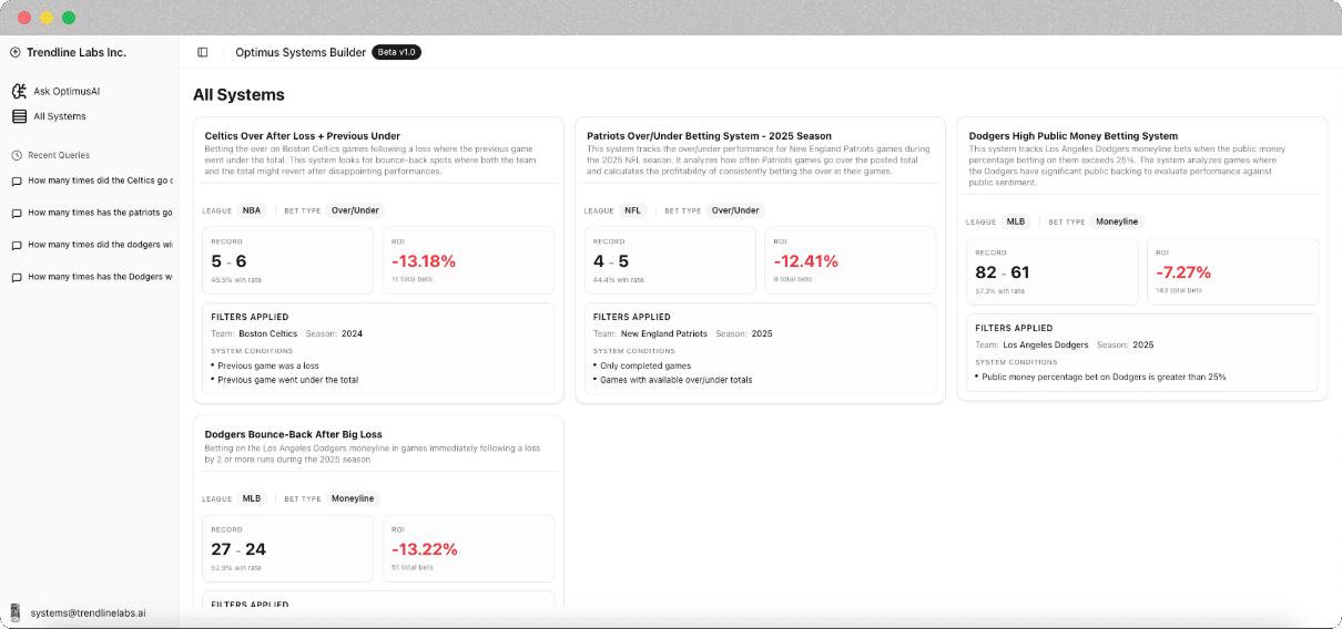 This is the first sports-specific LLM that can think, calculate, and build. Ask complex questions. Generate systems that actually win — complete with live filters, win-loss records, and ROI tracking based on real historical data.